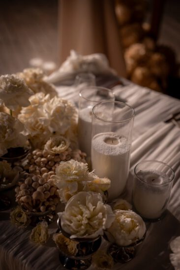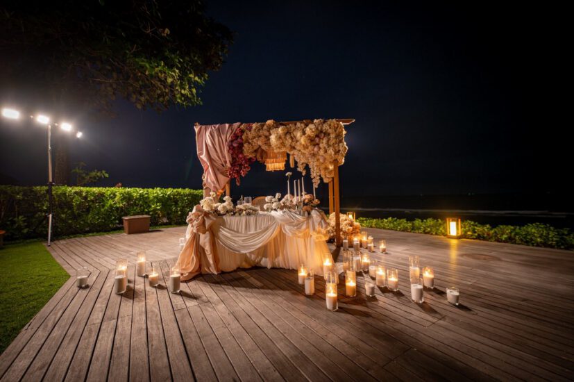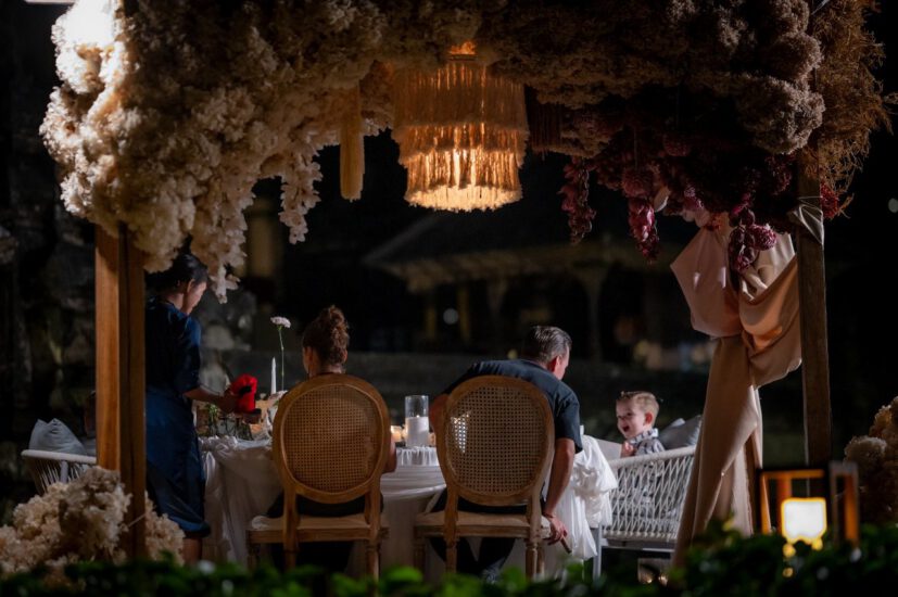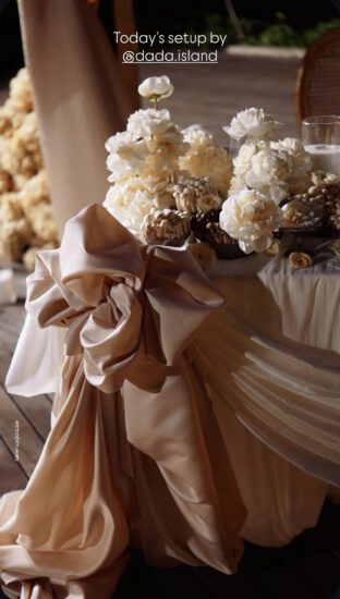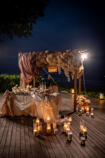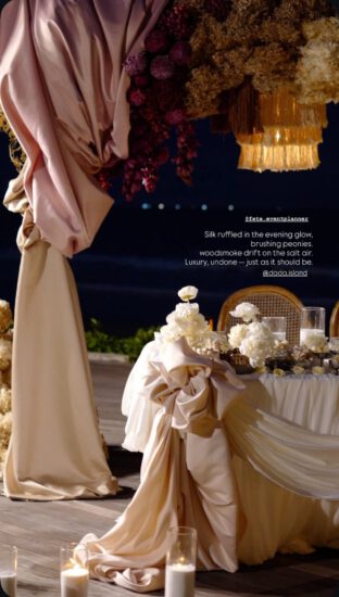 This intimate celebration was created exclusively for a valued regular client and his family, transforming the beach into a beautifully curated dining experience. A flower-adorned trellis framed the setting, with draped fabrics, soft candlelight, and a palette of beige, blush, and terracotta bringing warmth and refinement to the tablescape.